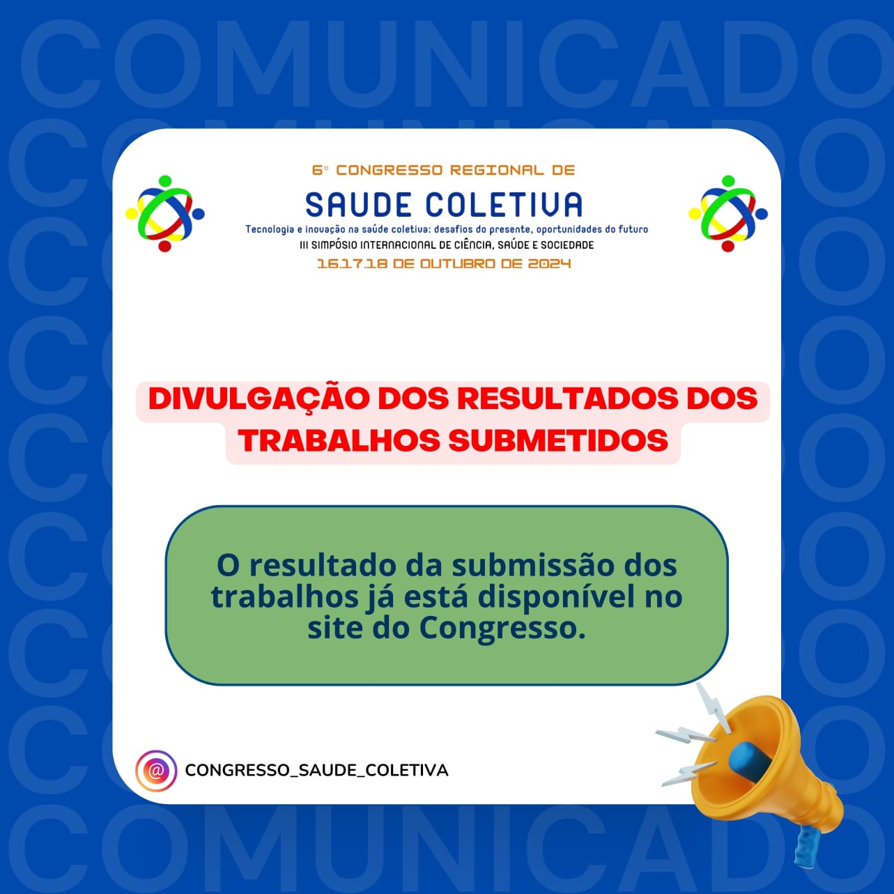 O resultado da avaliação dos resumos já está disponível, entre com seu login e senha no site e tenha acesso.